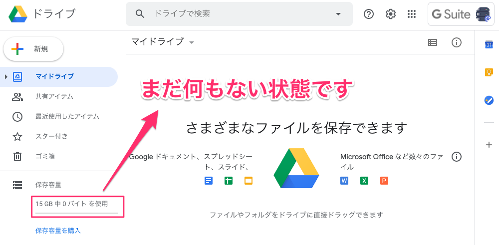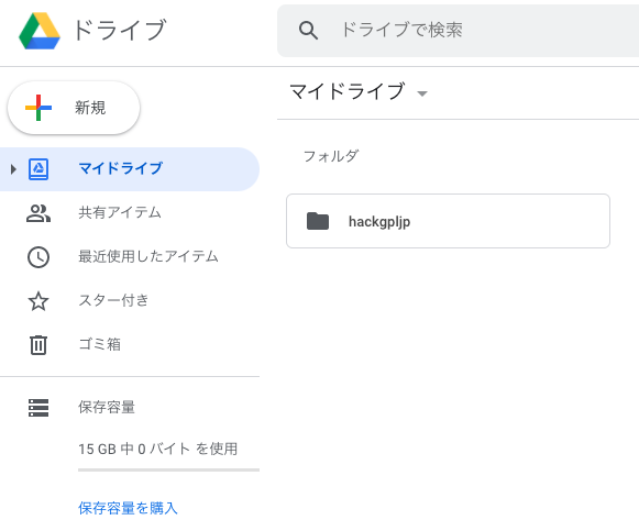 まず、何もGoogleDriveには入っていませんが一覧を出してみます。