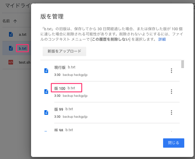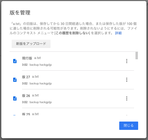 「a.txt」の旧版は、保存してから 30 日間経過した場合、または保存した版が 100 個に達した場合に削除される可能性があります。削除されないようにするには、ファイルのコンテキスト メニューで [この履歴を削除しない] を選択します。