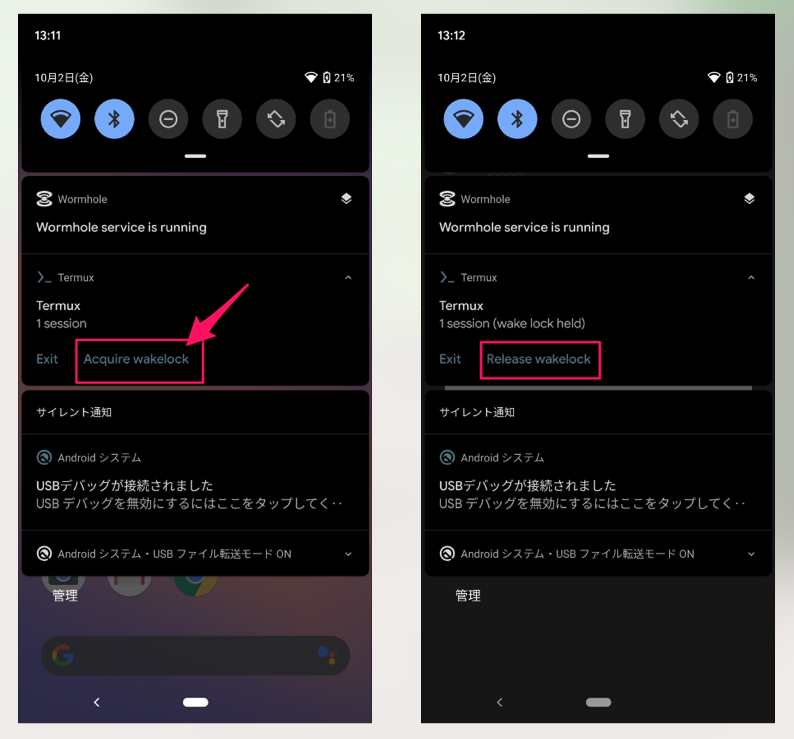 画面右の状態にしておきます。wakelockとは何か知りたい人は以下を参照してね。Termuxは、wakelockしておくか、しないか選択できるようになっています。