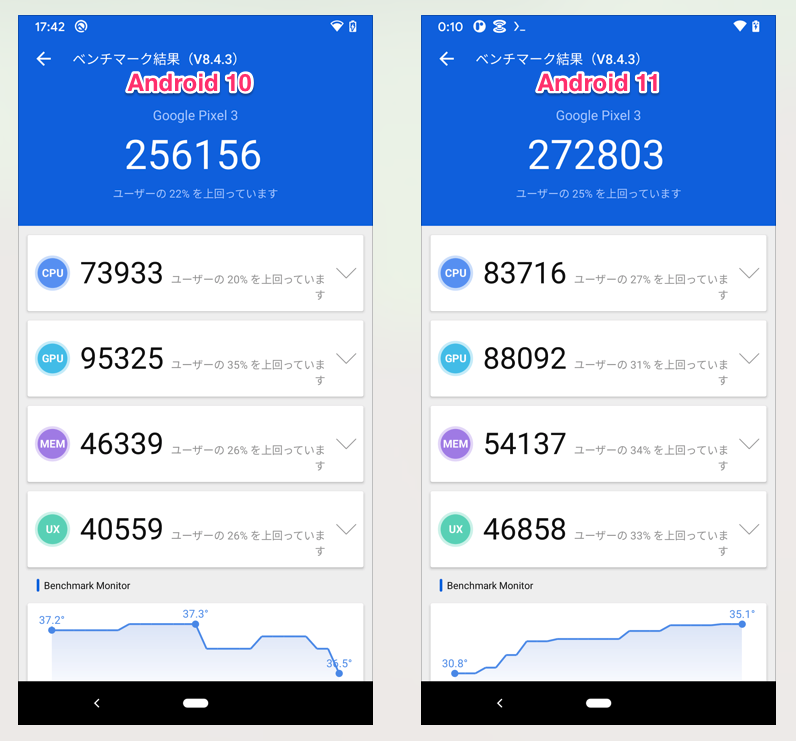 約、25マン〜27マンで今ではミドルクラスの上位というスコアです。計測の誤差なのか、少しAndroid11で計測したときの方が速くなっていますね。Kernel周りの影響か、チューニングを変えて来たのかそのあたりは不明です。