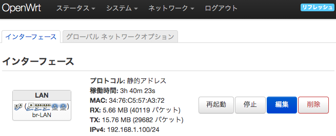 このようにインターフェイスはLAN側のポートだけ使って、あとは無線LANの設定をLANに紐づけているだけです。いわゆるブリッジ接続(アクセスポイント的な)で使っている感じですね。