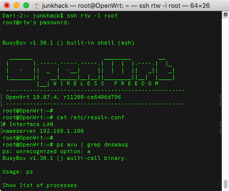 OpenWrtルータは、SSHも出来ますのでログインしてdnsmasqがどの設定ファイルを見ているか確認してみます。管理画面からも設定はできるんですが、どの設定項目がどのパラメータなのかわかりにくいので、直接設定ファイルを見てみました。