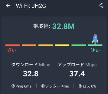 管理外のドメインも引いてくれるか確認しておきます。なんとか大丈夫そうなので、設定はよしとします。ハマった点としては5Ghz帯の無線LANだとどうしても、接続が切れてしまうようでした。何か、設定があるのかもですが解決できなかったので2Ghz帯のにしています。無線LANとスマホは近くに置いてあるのでまぁ実質問題ないでしょう。Pixel3からスピードテストすると以下のようです。
