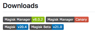 これは以下のオフィシャルサイト(GitHub)からダウンロードできます。筆者はCanaryビルドを使いました。安定番は、MagiskManagerv8.0.2です。