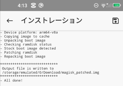 アプリを入れたら、起動させ「Magiskのインストール」からboot.imgを選択してパッチを当てます。以下のようになれば成功です。
