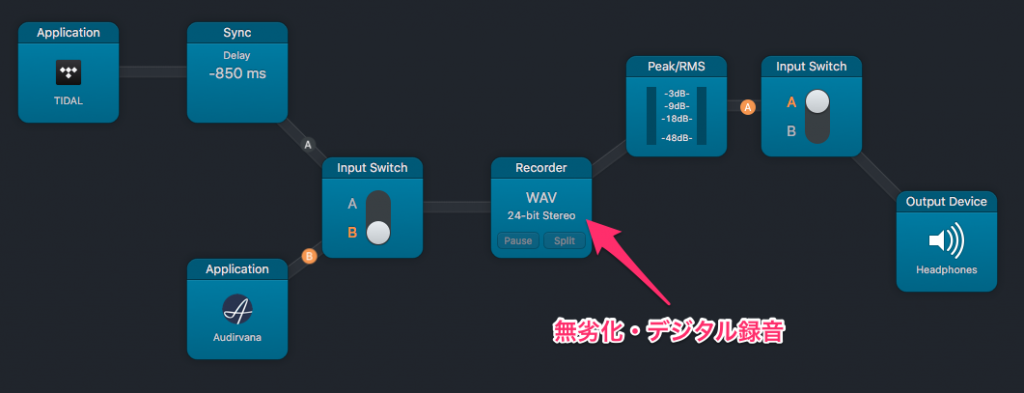 録音はあるソフトウェアを使い、以下のようにWAVの24bit/192Khzで無圧縮録音しています。