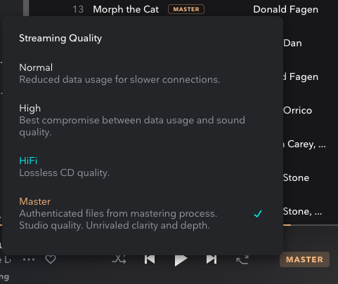HiFi録音は44.1kHz / 16ビットに制限されていますが、マスターは元のソースを反映します。これはCD品質から96 kHz / 24ビット、場合によってはサンプルレートが192kHzの超高解像度ファイルまでさまざまです。