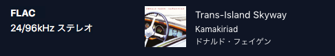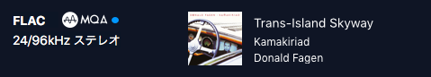 手持ちのハイレゾとTidalのMQAファイルを比べてみます。まず、Tidalの楽曲は、Donald Fagen のKamakiriad アルバムの1曲目です。曲名は Trans-Island Skywayで、24bit/96khz です。