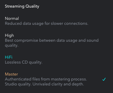 また配信サービスはCD品質の規格以上でも問題ないわけです。映像の配信データと比べたら、音の配信データなんて小さなものです。Tidalでは、CD品質をHiFiとし、それ以上をMasterというラベルをつけているわけです。