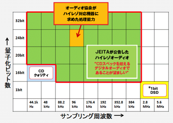 つまり、赤枠がハイレゾの定義です。厳密には、量子化ビット数が24bitでサンプリング周波数が96khz以上のようですね。赤枠の中の黄色部分がそれです。