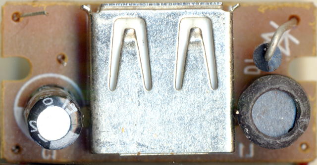 とりあえずは、USBの裏側にリードつけて、iPhoneに充電してるときにどのくらい電圧が降下するのか調べてみた。